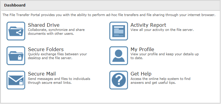 ![]() | Secure Folders provides browser access to authorized files and folders on the server. With Secure Folders, files can be transferred quickly between the desktop and server over HTTPS protocol. Since files in Secure Folders are stored on a standard file system, they can be directly accessed by backend applications and programs. For more information, see Secure Folders. |